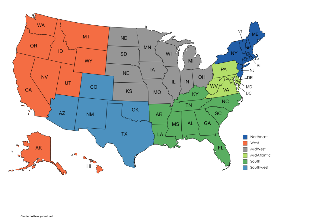 For our analysis, we used the statistics in the official employment reports from 27 full-time MBA programs* based in the United States. In particular, we focused on MBA graduates of these 27 MBA programs who are seeking employment, received an offer, and accepted an offer. Next, we compared the U.S. Region where the MBA Class of 2021 graduates attended business school vs. the U.S. region where the Class of 2021 graduates’ post-MBA jobs were located. Here is a visual map of the U.S. regions: