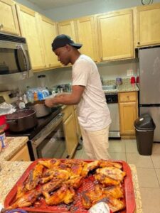I am the third of six children and the first of two boys. Growing up, I stuck around my mom and sisters, from whom I picked up excellent culinary skills. I make primarily west African cuisine but recently prepared Thai rice with curry flavor with the help of my friend and classmate. My signature dish is Nigerian party jollof rice.