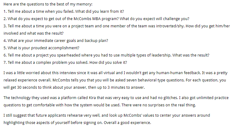Meanwhile, an MBA hopeful who completed the Texas McCombs video assessment offered some useful insights: