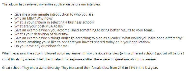 We’d love to hear how your MBA admissions interviews go! Be sure to share your MBA interview report here. It will be posted anonymously and help fellow applicants understand what to expect in their interview. Some MBA interview reports may even be eligible for a gift card!