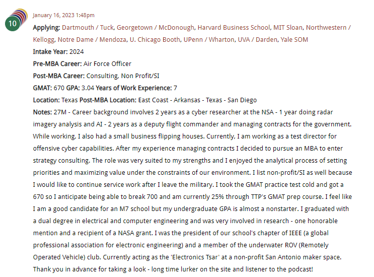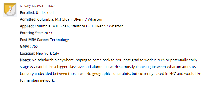 First up, an early-bird candidate who appears to have a very interesting military background with a focus on cyber security. They worry about their undergraduate record (3.04 in Electrical and Computer Engineering) and are taking steps to mitigate that. As part of that, they need to target a very strong GMAT score. That said, Alex and Graham love the overall profile, and think there might be options at the very best programs when this candidate applies next season. This week’s second candidate has a super GMAT of 760. They have an accounting degree with a 3.23 GPA (slight concern) and a CPA. They also have a passion for online gaming, which may shape their long term goal, and Alex and Graham think this might be an interesting aspect of their profile to set them apart. Along those lines, your hosts did wonder why USC / Marshall is not a target program. Finally, this week’s final candidate review comes from a DecisionWire post where a lucky applicant is debating between offers at UPenn / Wharton, Columbia and MIT / Sloan. They want a large network, which favors Wharton and Columbia, and they want to be in New York City, post MBA, in tech or early stage VC. Comments on the site leaned towards Wharton, but the applicant may need to wait to see if Columbia will offer them scholarship…