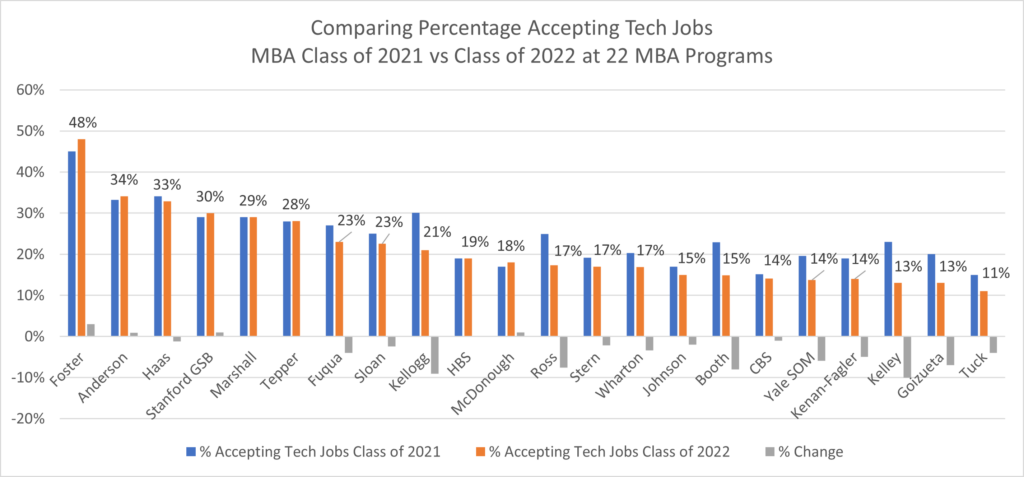 When comparing tech industry jobs accepted by the full-time MBA Class of 2021 vs. the Class of 2022, 15 of the 22 MBA programs report a decline. Of the remaining seven schools, three business schools (HBS, Marshall and Tepper) reported no change in the percentage of tech jobs accepted and four MBA programs (Stanford GSB, Anderson, McDonough and Foster) actually increased their tech jobs accepted.