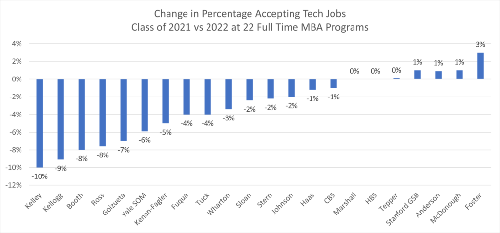 Given this overall tech industry hiring slowdown from 2021 to 2022, quite a few MBA programs reported a decline in tech industry jobs accepted by the Class of 2022 compared to the Class of 2021.