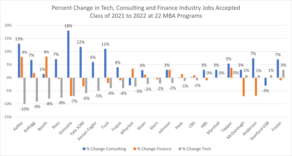 One trend among these 22 MBA programs is a general migration from tech industry jobs accepted in the Class of 2021 to consulting jobs accepted in the Class of 2022. For example, 15 of the 22 business schools reported a decline in tech industry jobs accepted while 17 of 22 business schools reported an increase in consulting jobs accepted.