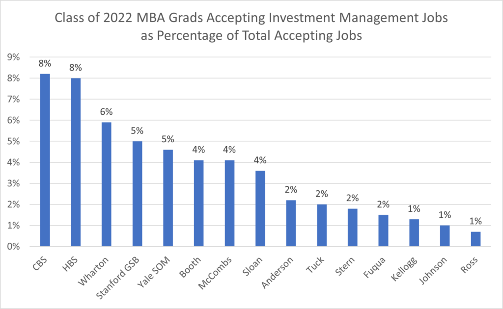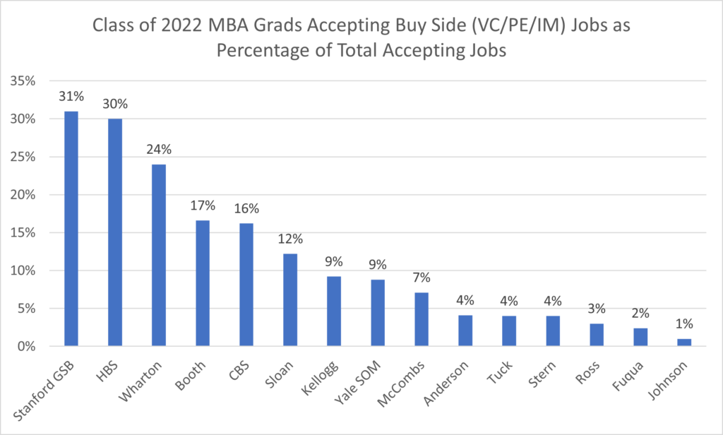 Of course, business schools such as Anderson (4%), Tuck (4%), Stern (4%), Ross (3%), Fuqua (2%) and Johnson (1%) also provide opportunities for students to pursue buy-side jobs, but not in the same numbers as the other nine MBA programs.