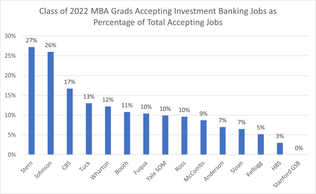 It is interesting to see that HBS only sent 3% of the Class of 2022 into investment banking jobs and Stanford GSB sent 0%. Meaning, while finance jobs accepted represent over 30% of jobs accepted at both HBS and Stanford, the HBS and GSB MBA graduates are mostly accepting buy-side finance jobs not sell-side finance jobs. In contrast, while finance jobs accepted among Class of 2022 MBA grads from both Johnson and Stern also represent over 30% of jobs accepted, the majority of these jobs accepted are for sell-side investment banking jobs not buy-side jobs in venture capital, private equity or investment management.