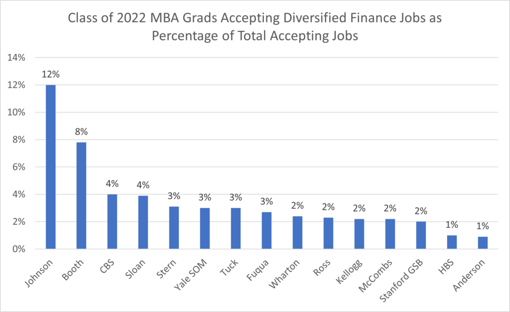 Johnson (12%) and Booth (8%) are the leaders in this category. In fact, both schools increased their share of these finance jobs in the last year.