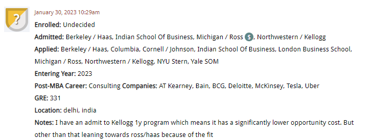 This week’s first candidate is likely from an over-represented applicant population, and Alex and Graham wonder if applying in Round 2 and 3 this season will give them their best set of options. They are working in operations at a hedge fund, in India. Their counting stats are decent (710 / 3.81) but the GMAT doesn’t really stand out. They also are not heavily involved in current outside activities (despite having been more active in college). Alex and Graham are hoping for the best, but worry that they may need to think about reapplying in the next season, targeting Round 1. This week’s second candidate has a very interesting profile with decent numbers. They work in sales in the technology space, so we are hoping there’s enough there to warrant access to top programs. The final candidate for this episode is weighing offers from Northwestern / Kellogg (1 year program), Berkeley / Haas, and Michigan / Ross (with a scholarship). They want to transition to consulting, and Alex makes a strong case for Ross in this instance.