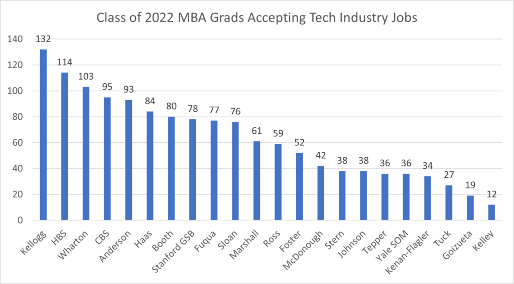 In summary, among the 22 MBA programs, Kellogg, HBS and Wharton stand out as placing the largest number of Class of 2022 MBA graduates into tech jobs while West Coast schools such as Foster, Anderson, Haas, Stanford GSB and Marshall send the highest percentage of Class of 2022 graduates accepting tech jobs.