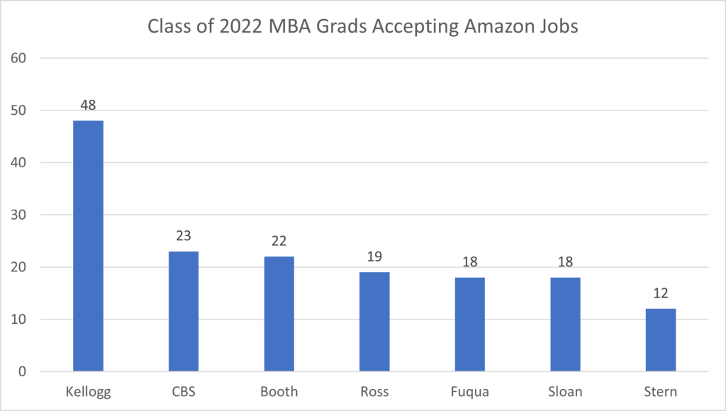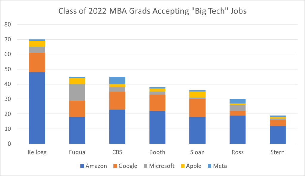 Of these seven MBA programs, Amazon hired the most Class of 2022 graduates from Kellogg (48), followed by CBS (23), Booth (22), Ross (19), Fuqua (18) and Sloan (18). It is interesting to see that Amazon’s hiring of Class of 2022 MBA grads at Kellogg is more than double the Amazon hires at any of the other six business schools. Amazon not only is the largest tech employer, but also is one of the biggest employers of graduates from top MBA programs.