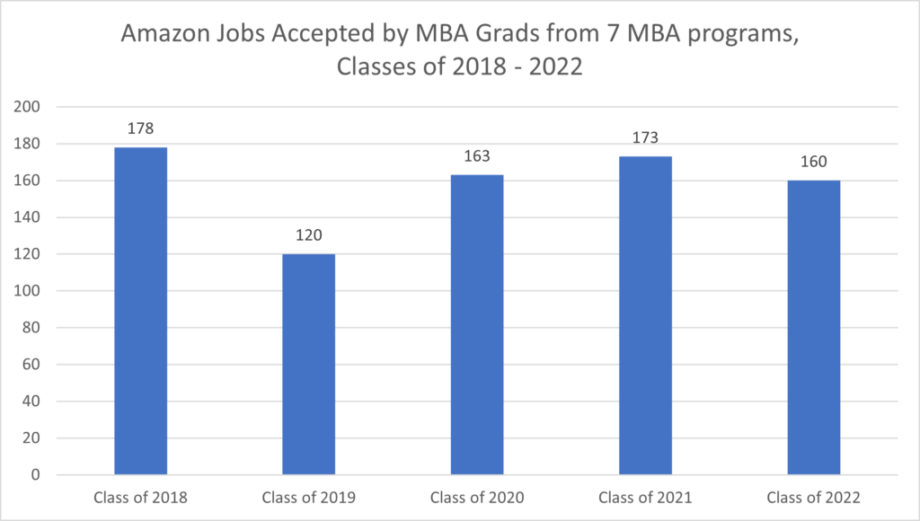When reviewing the Amazon jobs accepted by recent MBA graduates of these seven MBA programs over the past five years, you can see that Amazon hired between 160 – 173 MBA graduates per year from these seven MBA programs in each of the last three years.