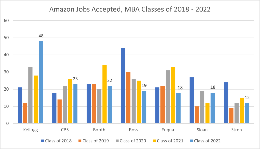 However, there is more variation in Amazon hires by business school. Kellogg saw a large growth in Amazon jobs accepted, from 21 hired in the Class of 2018 to 48 hired in the Class of 2022. In contrast, Ross saw a decline from 44 hired in the Class of 2018 to 19 hired in the Class of 2022. Aside from Kellogg, the Amazon Class of 2022 MBA hiring for CBS (23), Booth (22), Ross (19) and Fuqua (18) and Sloan (18) was in a 18 – 23 hires per school range. We don’t know if this was a coincidence or if Amazon was seeking about 20 hires per school.