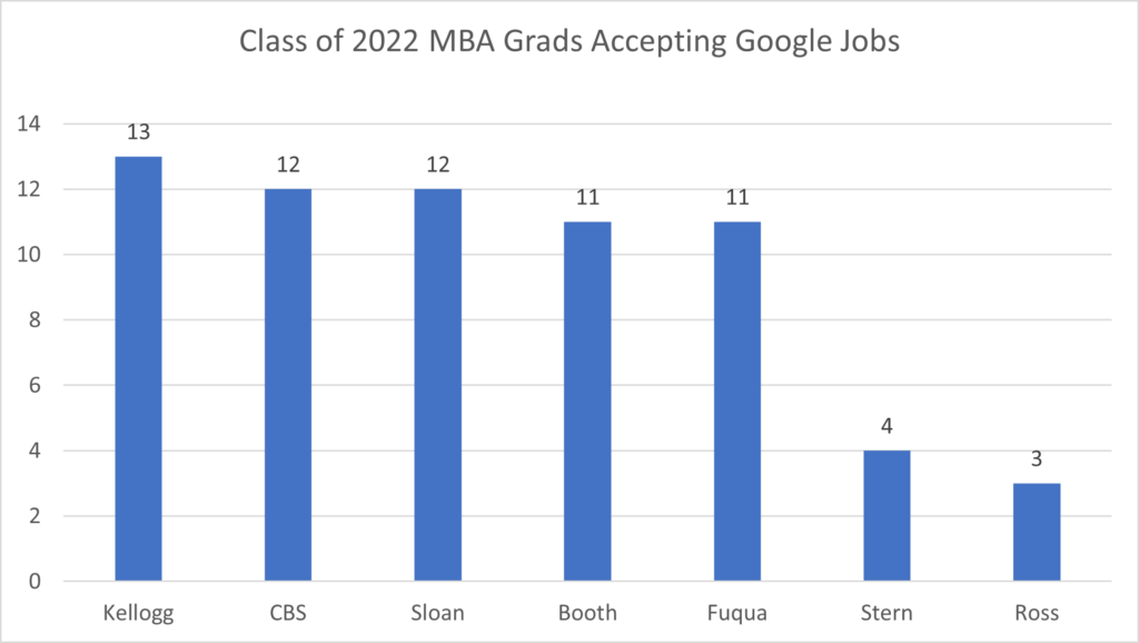 Google hired 66 Class of 2022 MBA graduates from these seven MBA programs. Google hired between 11 – 13 MBA graduates each from five schools: Kellogg (13), CBS (12) and Sloan (12), Booth (11) and Fuqua (11). Google also hired four from Stern and three from Ross.