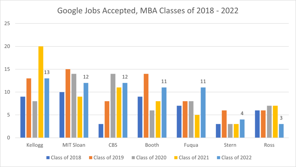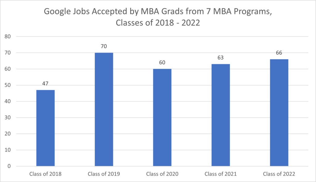 Across these seven MBA programs, Google actually increased its MBA hiring from 47 in the Class of 2018 to 60 in the Class of 2020 to 66 in the Class of 2022.