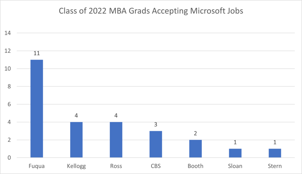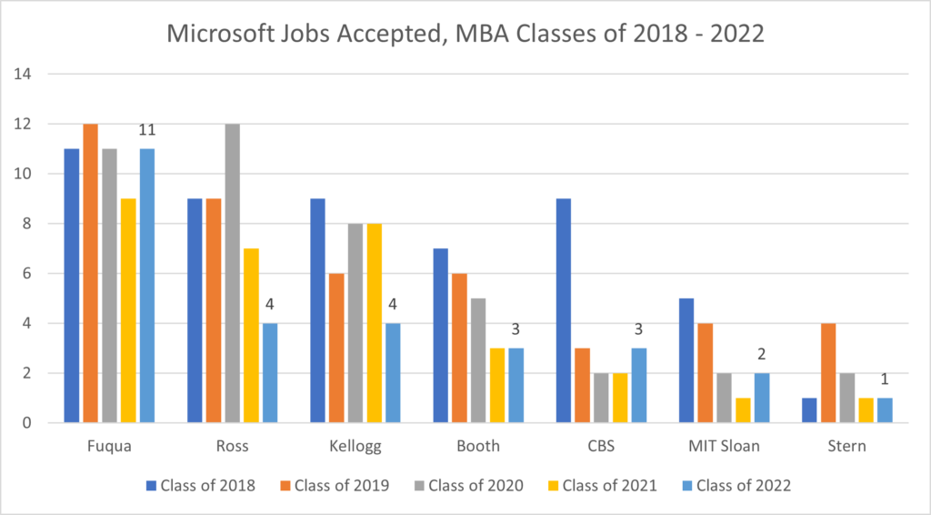 Microsoft has traditionally been a big hirer of MBA talent, though they have been a less active MBA recruiter than they were several years ago. Among these seven MBA programs, Microsoft hired the most Class of 2022 graduates from Fuqua (11), followed by Kellogg (4), Ross (4) and CBS (3). Microsoft also hired two from Booth and one each from Sloan and Stern.