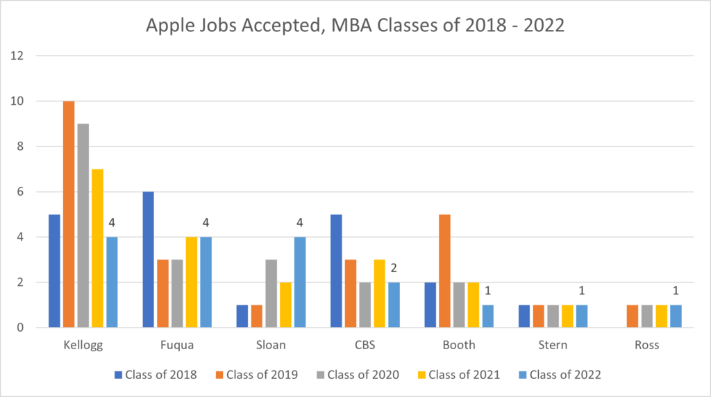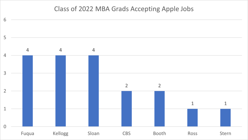 While Apple is a big tech company, they have traditionally hired fewer MBA graduates from these seven MBA programs than some of their Big Tech peers. Among the Class of 2022 MBA graduates, Apple hired only four each from Fuqua, Kellogg and Sloan, followed by two each from CBS and Booth and one each at Ross and Stern.