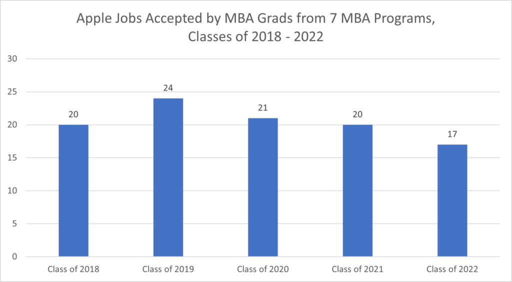 Across the seven MBA programs, Apple reduced its hiring for MBA graduates from 24 in the Class of 2019 to just 17 in the Class of 2022. Kellogg saw the biggest decline from 10 Apple hires in the Class of 2019 to just four Apple hires in the Class of 2022 while MIT Sloan saw an increase in Apple jobs.