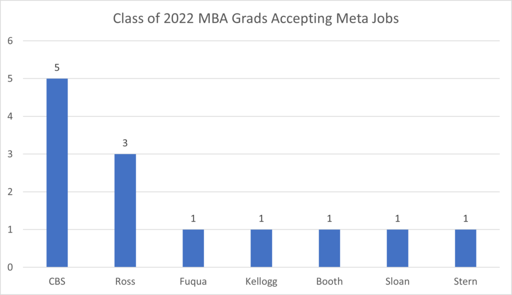 While Meta is a big tech company, they have been less active at hiring Class of 2022 MBA graduates from these seven MBA programs. CBS leads with five Meta hires, followed by Ross with three Meta hires. The rest had one hire each.