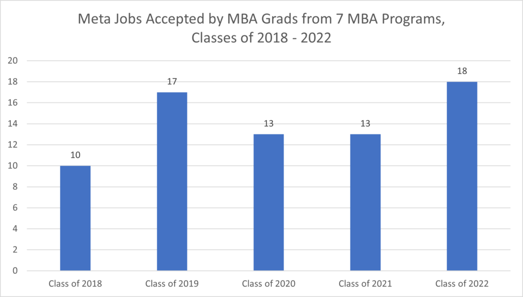 When reviewing the collective Meta hiring across these seven MBA programs, Meta has actually increased its MBA hires from 10 in the Class of 2018 to 18 hires in Class of 2022.