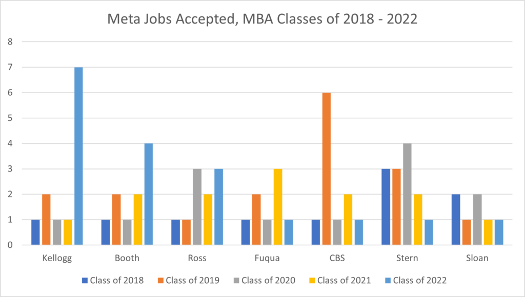 Reviewing the Meta hiring at the individual MBA programs, Kellogg saw the largest increase of Meta jobs in the Class of 2022, followed by Booth. In contrast, Stern has seen a decline in Meta jobs.