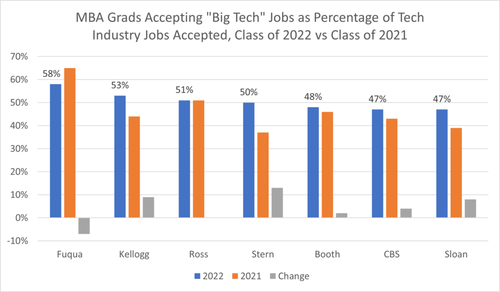 To account for the difference in class size across these seven MBA programs, we will now compare the Big Tech jobs accepted by MBA graduates in the Class of 2022 vs the Class of 2021 as a percentage of total tech industry jobs accepted by these graduates.