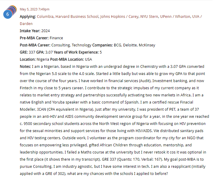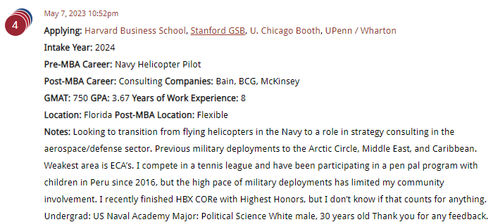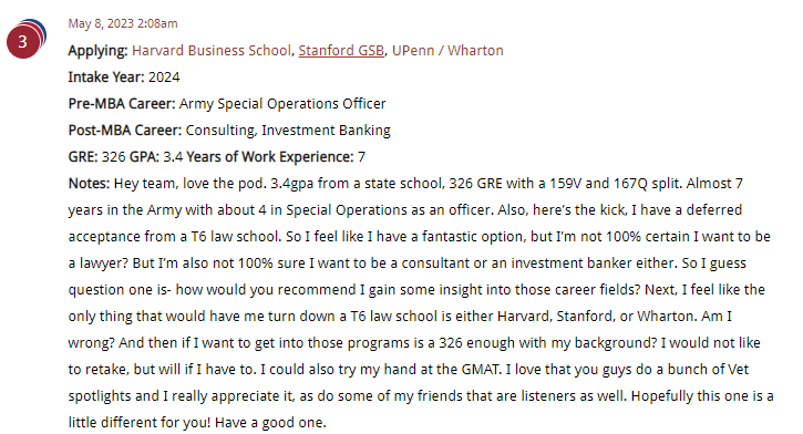 WireTaps candidate #1 is a military candidate (special ops) who already has a deferred offer at a top 6 law program, and is debating whether it makes sense to stay the course or consider pivoting and applying to top tier MBA programs. Alex and Graham discussed some of those opportunities, and also whether or not this applicant should retake the GRE. Their current score is 326, but they achieved this without any preparation… This week’s second candidate is also from the military (a naval helicopter pilot) and has fantastic numbers. Their one concern is the relative lack of extra curricular/volunteer activities. Alex and Graham discussed why the adcom is generally more flexible in this regard, for military candidates. (Both of these military candidates look like they belong at top tier MBA programs!) Wiretaps candidate #3 is from Nigeria and is reapplying to several programs for next season. They have improved their GRE score from 302 to 337, which is an incredible jump! Alex and Graham really think this will certainly help, because their other potential area of weakness was their relatively lower GPA. Their work experience and extra activities sound very interesting.