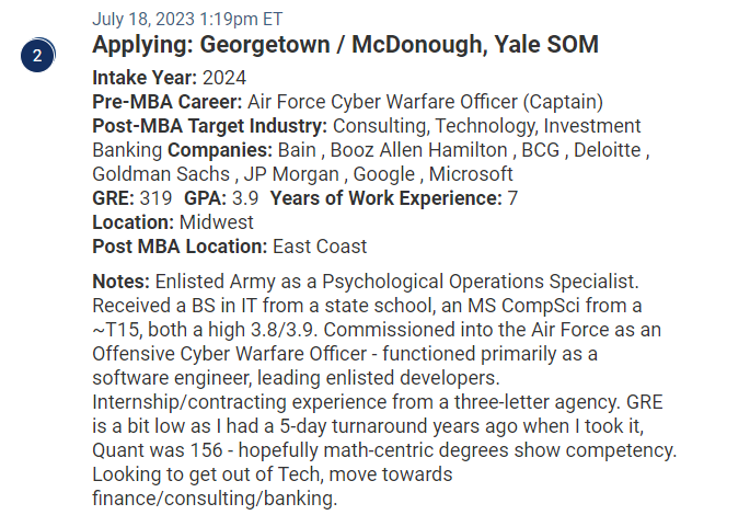 This week’s first MBA admissions candidate has not yet taken the GMAT, but everything else points to a very strong profile, so Alex and Graham hope that with a GMAT in the 700s, she will be strongly considered by the very best programs. One concern this candidate expressed is her extra curricular profile, which is something Alex and Graham discuss on the show. This week’s second candidate appears to have a very solid work profile, combined with strong numbers (740 GMAT, 3.76 GPA). Alex and Graham encourage them to apply in the first round, as it’s possible that they are part of a more over-represented pool of MBA candidates. Our final candidate comes from the military, and also has a masters degree. They are only targeting Georgetown / McDonough and Yale SOM, for personal reasons. Their GRE score is 319, after 5 days of prep, and having taken the test several years ago. Alex and Graham really hope they retake this test after more thorough preparation. This should open more opportunities (including scholarships) for an otherwise strong candidate.