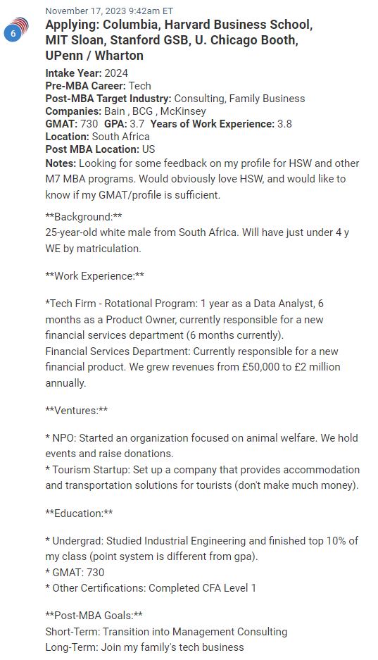 This week’s first MBA admissions candidate is from South Africa, and has a good combination of a strong GPA and 730 GMAT. Their work experience, via a rotational program in tech, looks very decent. They are also quite involved in activities outside of work. They are targeting the very elite M7 programs, but we do think they have a strong overall profile.
