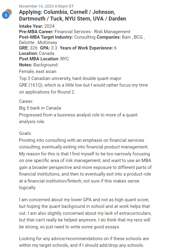 This week’s second MBA candidate is originally from East Asia, but now lives and works in Canada, from where they did their undergraduate degree. Their GPA is slightly lower than average, but Canada has less grade inflation. Their GRE score is 326, which is decent. They are targeting top 16 programs, which do look within reach.
