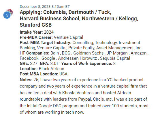 This week’s first MBA admissions candidate is from Africa and has really interesting professional experience which may help them stand out. Their GRE score is a very respectable 327, but we worry that their GPA of 3.01 may raise concerns, despite it being a computer science degree.