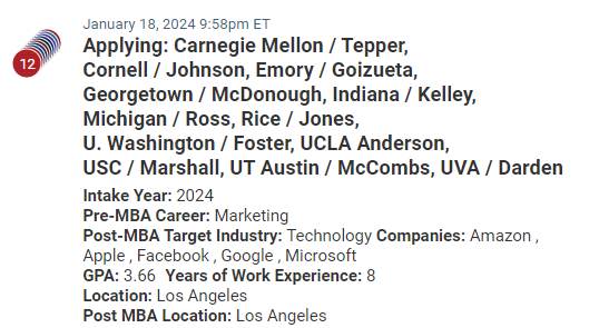 This week’s first MBA admissions candidate has applied to 12 programs, via The Consortium. They have a very good GPA (3.66) but they have waived the GMAT. Because they are seeking scholarship offers from the programs they are targeting, we suggest they still try to take the GMAT or GRE.