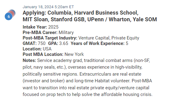 This week’s second MBA candidate is planning to apply next season, and has a strong profile from the military. They also have a good GPA from one of the Service Academies, as well as a great GMAT of 750. We think they will be a very strong candidate, but we provided some thoughts on their post MBA plans.