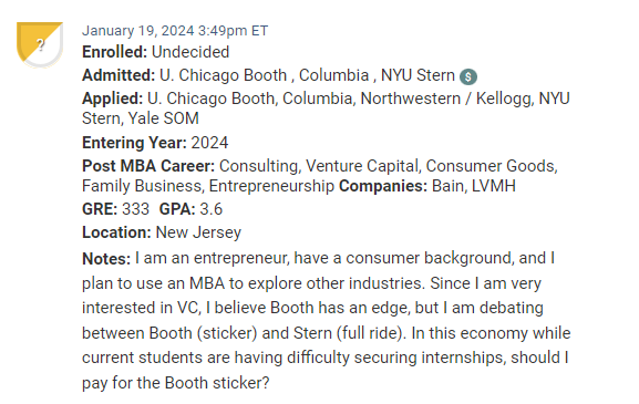 The final MBA candidate for this week has offers from Chicago / Booth, Columbia Business School, and NYU Stern. Their offer from Stern is a full-ride, which makes their decision very difficult. They would like to go into venture capital, but that may be a tough industry to break into, wherever they attend.
