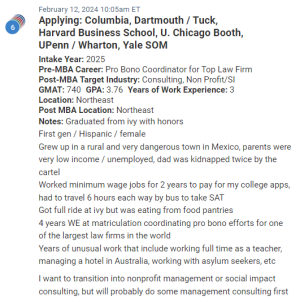 This week’s first MBA admissions candidate has a very interesting ‘lived experience’ and has come very far as a first generation Hispanic candidate. Their academic profile is superb and they have a 740 GMAT score. We think they should be targeting the very best programs.