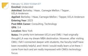 The final MBA candidate for this week has offers from UCLA / Anderson, with money, Berkeley / Haas, no money, and CMU / Tepper with money. Initially they wanted to do their MBA program in Los Angeles. Now they are debating between Anderson and Tepper.