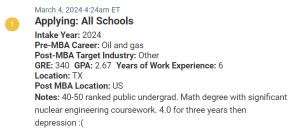 This week’s first MBA admissions candidate has a super GRE of 340, but unfortunately has a poor academic record, due to the onset of depression. They now have six years of work experience in the oil and gas sector. We think they will have a few challenges to mitigate the undergraduate record, but it is doable.