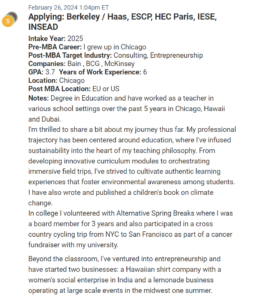 This week’s second MBA candidate has an education background and has served as a teacher, with a special interest in climate change. They want to pursue the MBA to transition into the business of sustainability. They still need to take the GMAT or GRE, and we think that doing very well on the test will be very important.