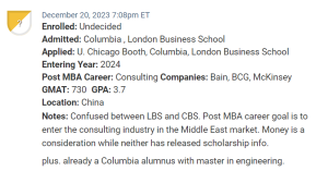 The final MBA candidate for this week is deciding between London Business School and Columbia Business School. They are from China and want to work in consulting in the Middle East. They already have an engineering degree from Columbia, and Columbia has offered them a significant scholarship.