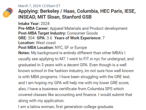 This week’s first MBA admissions candidate has a very interesting profile having graduated from FIT, with a strong GPA; she is also a first-generation college graduate and has seven years of experience. We are very concerned with her lower GRE score of 304. Any increase in that score should have a very positive impact on MBA options.
