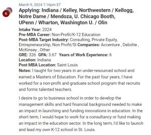 This week’s second MBA candidate has a very good academic profile, along with a 326 GRE. They are very focused on the education sector, with a long term goal of starting their own school. We really like the profile, and wonder if they should also add Harvard and Stanford to their list of target programs.