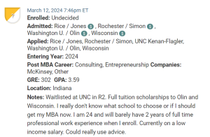 The final MBA candidate for this week has several offers from top-30 programs, with significant scholarships. They are also on the waitlist for UNC / Kenan Flagler. They only have two years of experience and are considering whether to attend next season, or to wait and reapply.