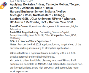 This week’s second MBA candidate is planning several years ahead for their MBA experience. They need to overcome a very low 2.4 GPA. There are steps they can take to help mitigate this concern, and we detailed some of those steps.