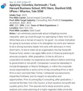 This week’s first MBA admissions candidate has a strong passion for focusing on income inequality issues, and how an MBA can help them develop their skills to further impact this issue. They also have decent numbers, and may well be a strong MBA candidate.
