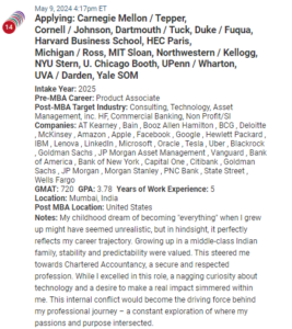 This week’s second MBA candidate is from India, and appears to have an impressive professional background, evolving from accountancy to product management in tech, with a focus on social impact. They should target the first rounds.