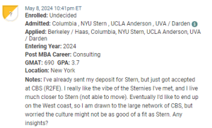 The final MBA candidate for this week is deciding between NYU / Stern, to which they have already paid a deposit, and Columbia, where they have only recently been admitted. In the long run, they want to be on the west coast.