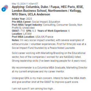 This week’s first MBA admissions candidate appears to have a very strong professional career, and is from Latin America. While their GMAT is decent (710), their GPA is the weak point. We discussed strategies to mitigate the lighter GPA.