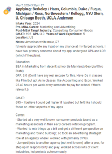 This week’s second MBA candidate also has a modest GPA of 3.0. They have a super GMAT (695 on the new version of the test) and appear to have done well in their marketing career, despite navigating a layoff.