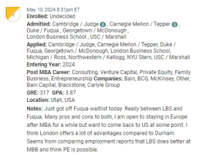 The final MBA candidate for this week is deciding between Duke / Fuqua and London Business School. These are two quite different options, and we discussed those differences. They want to be in the United States in the longer term, post MBA.