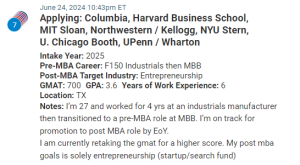 This week’s first MBA admissions candidate began their career in manufacturing, and then moved on to MBB consulting; we like that transition. They plan to retake the GMAT, which is currently a 700.