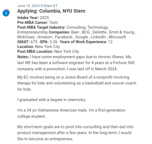 This week’s second MBA candidate has 12 years of experience, placing them at the long end of the spectrum; they will need to justify “why now” is the right time. They have had some employment gaps, due to chronic health issues, and were recently laid off from their most recent role, unrelated to health. They do appear to have developed a strong resume, but they will face challenges in the MBA admissions process.